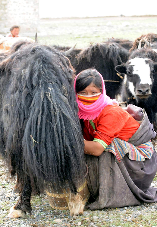 這是藏北申扎縣申扎鎮三村戴著防曬口罩和圍巾擠牦牛奶的青年牧女(唐召明2009年夏攝)