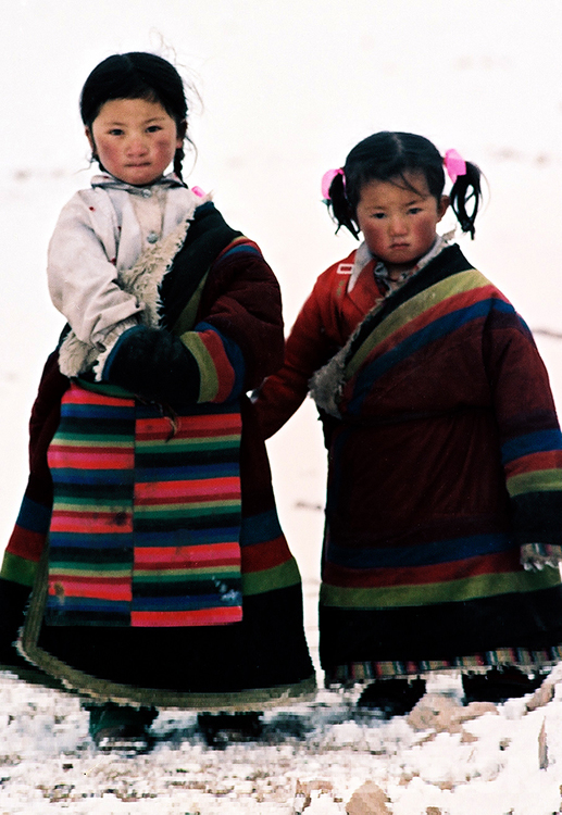 那是1989年歲末最后幾天,我隨藏北那曲地區(現那曲市)基層政權建設工作現場會“訪問團”來到文部辦事處(現尼瑪縣)參觀。來到卓瓦鄉時,我眼前突然一亮:在雪地上玩耍的草原小姐妹,三五歲的樣子,身著五彩羔皮藏袍,扎著羊角小辮,臉頰上印刻著深紫色“高原紅”。那是草原上一道最美麗的風景線,我不由得按動手中相機快門……