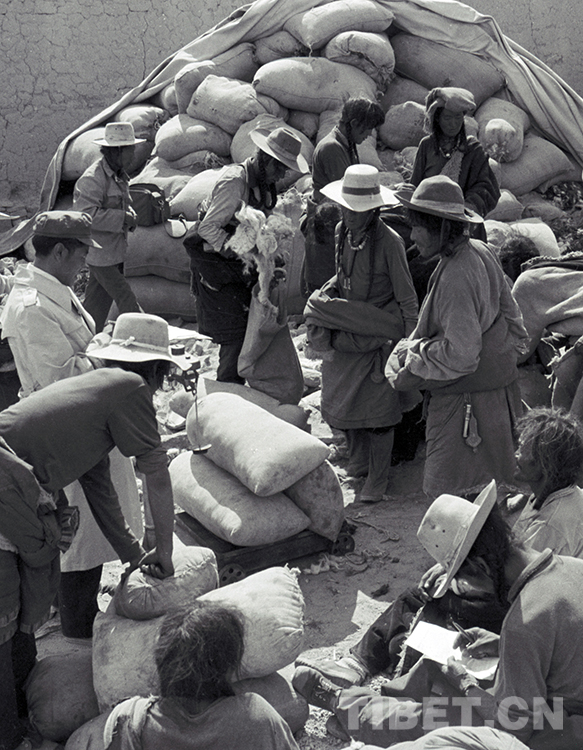 這是文部辦事處牧民群眾來到辦事處畜產品收購站交售羊毛,并將羊毛裝袋過秤完成(唐召明1989年12月攝)