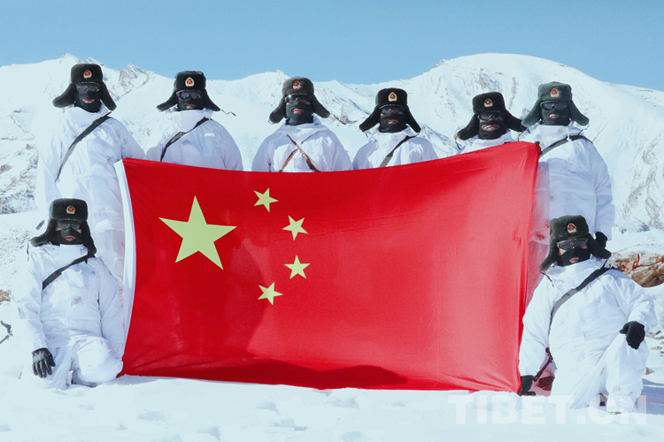 圖為阿里軍分區某邊防團官兵在巡邏路上展示國旗 攝影:劉曉東