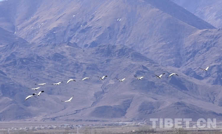 圖為1月18日,西藏林周強(qiáng)嘎鄉(xiāng)附近一群黑頸鶴飛過(guò) 攝影:次旦拉姆