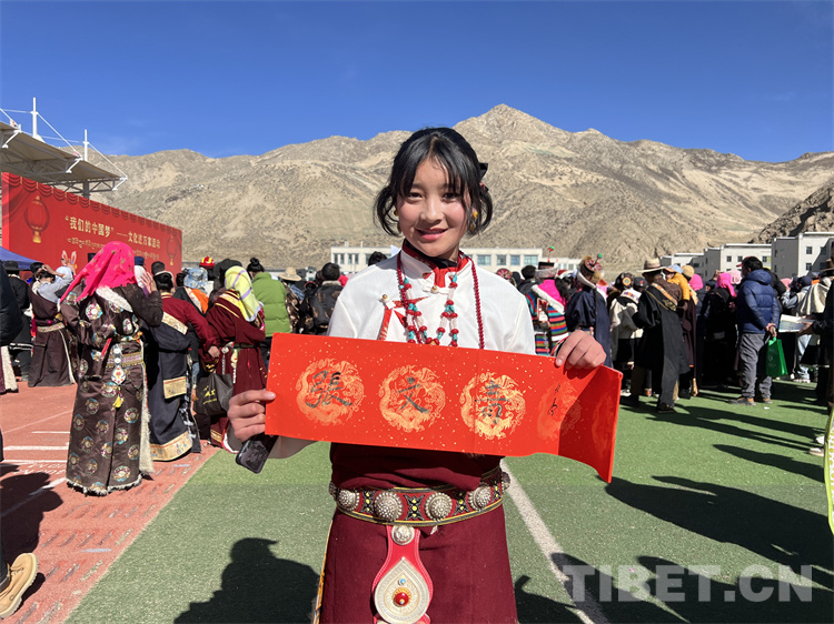 “我來自那曲安多縣,在森布日生活已有近一年,這里氣候暖,基礎設施齊全,真是趕上了好政策”66歲的多布杰說,他還主動拿起書法家現(xiàn)場書寫并贈送給他的吉祥對聯(lián)說:“今天真是很開心,觀看了一場精彩的節(jié)目,還得到了書法家寫的‘扎西德勒’吉祥對聯(lián),這個我要貼在家里的門窗上”。