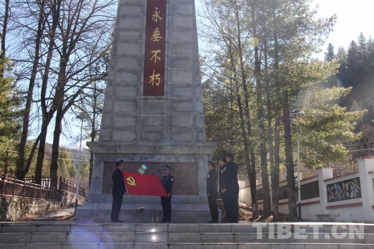 圖為西藏邊檢總站執法調查支隊執法調查七隊民警在亞東革命烈士陵園烈士紀念碑前對黨旗宣誓 攝影:李渠成