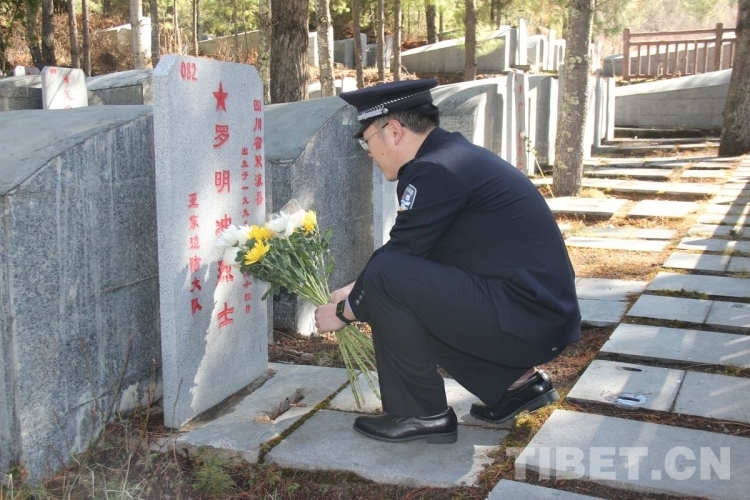 圖為西藏邊檢總站執法調查支隊執法調查七隊民警向烈士敬獻鮮花 攝影:李渠成