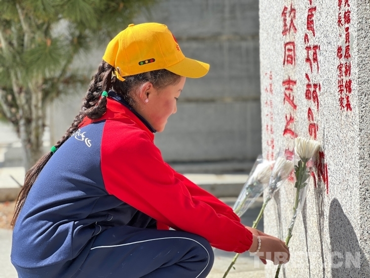 圖為西藏日喀則市昂仁縣多白鄉小學生為革命先烈敬獻鮮花 攝影:德吉卓瑪