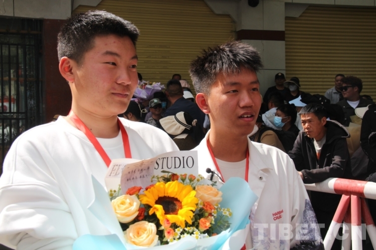 6月8日下午,在拉薩中學考場外,家長們穿著藏裝、旗袍、印有“金榜題名”“旗開得勝”等加油短袖,手捧鮮花和哈達迎接第一波結束高考的考生。“今天,閨女終于要結束高中生活了,希望她能如愿考上軍校。”劉先生夫婦穿著專門為女兒定制的加油短袖,備好鮮花到考場外迎接女兒。像他們一樣,考場外拿著鮮花與哈達、祝賀橫幅、勵志牌等的考生家屬和親戚漸漸多了起來。