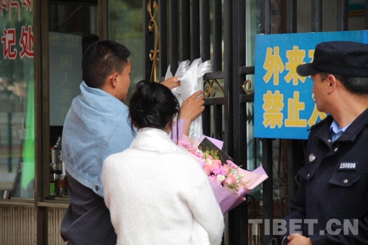 圖為考生考試結束后向母校的大門掛哈達表感激 攝影:德吉卓瑪