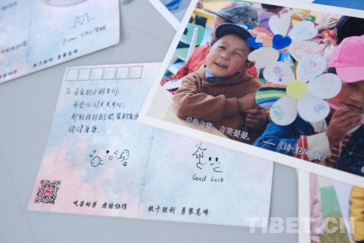 參與活動(dòng)的同學(xué)們?cè)诜逶粕缛宋目瓶缄?duì)準(zhǔn)備的明信片上寫(xiě)下對(duì)當(dāng)?shù)匦∨笥衙篮玫淖8!R粡垙垖?xiě)著滿(mǎn)滿(mǎn)關(guān)切話語(yǔ)、畫(huà)著生動(dòng)可愛(ài)圖案的明信片上,飽含著中國(guó)農(nóng)業(yè)大學(xué)師生對(duì)雪域高原孩子們滿(mǎn)滿(mǎn)的愛(ài)意。