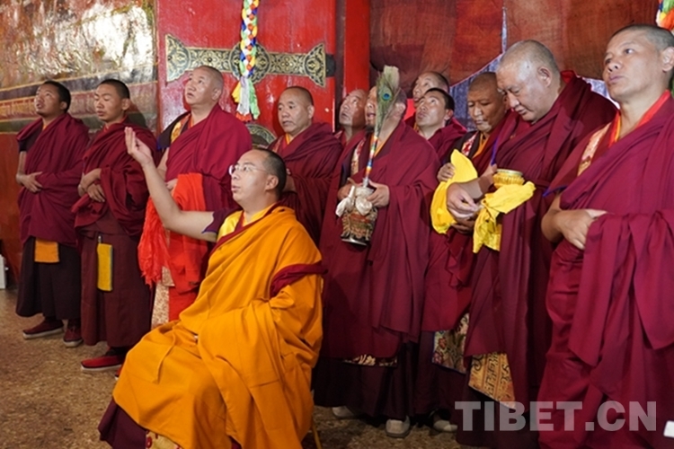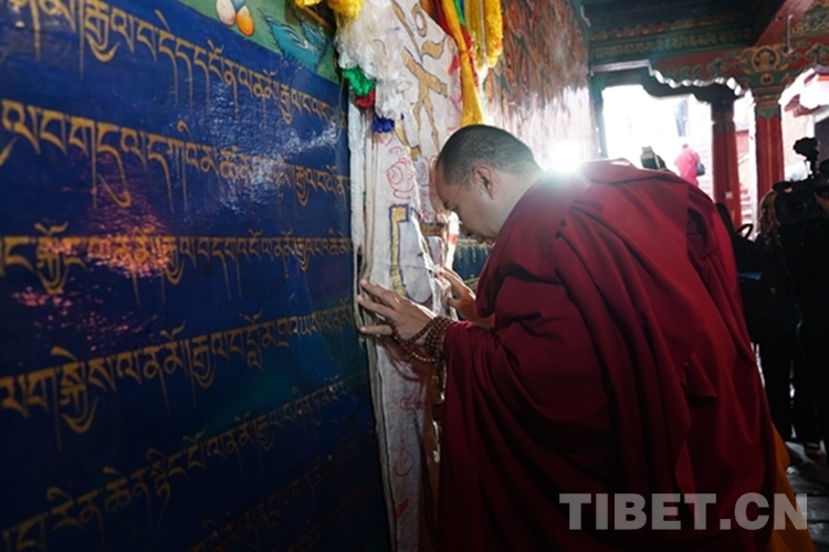 在措欽大殿,班禪虔誠叩拜供奉于此的佛祖釋迦牟尼佛像和藏傳佛教格魯派始祖宗喀巴佛像,與僧眾共同念誦經文,之后回到寢宮拉讓殿。