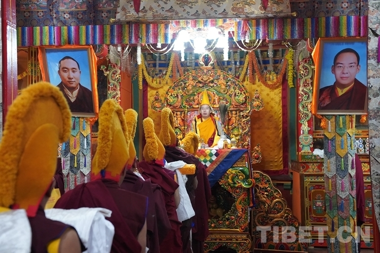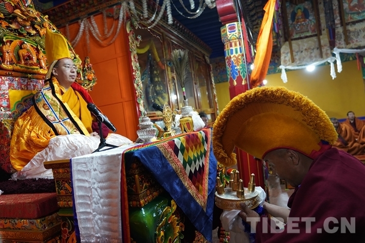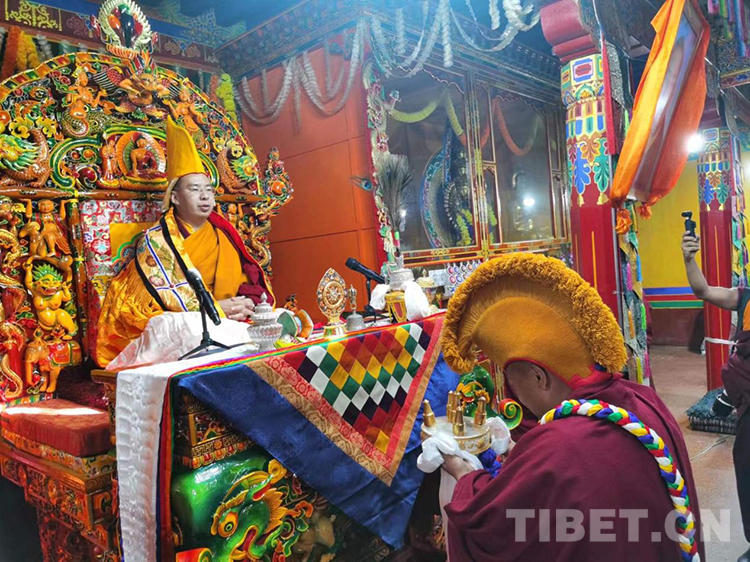 當日的拉定寺裝飾一新,班禪一行抵達后,現場法號齊鳴、法螺合奏,倫珠晉巴和僧眾在寺廟前舉行了隆重的歡迎儀式。隨后,在手持香爐、寶傘高僧的引導護送下,班禪步入主殿上寶座,向寺廟僧眾傳授《三主要道論》,為僧眾摸頂賜福、發放布施。