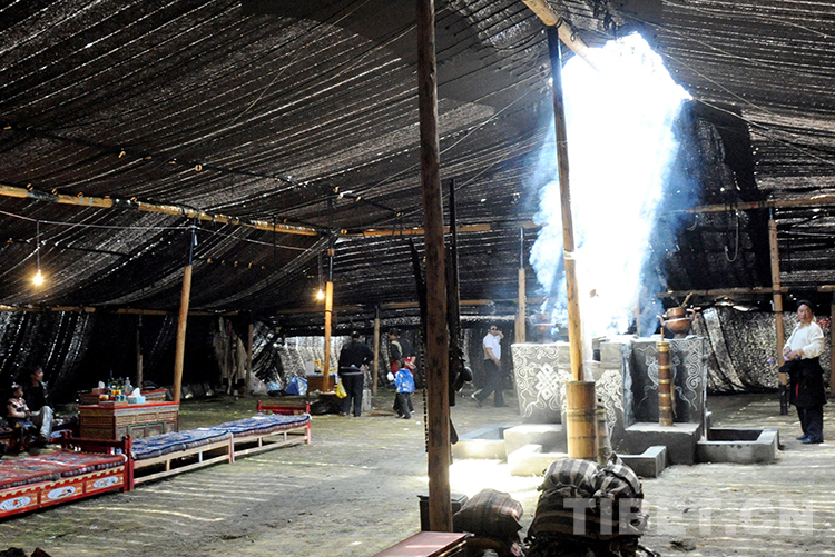 在那曲賽馬盛會(huì)上供游人參觀的“巴拿扎西林杰大黑帳”內(nèi)景。這頂大“黑帳”占地面積3600平方米、內(nèi)部有效面積666平方米,可供上百人自由活動(dòng)(唐召明2009年8月12日攝)
