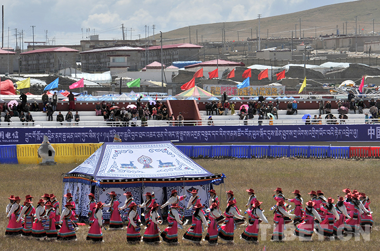 在新改建的那曲賽馬場一角的歌舞表演。當(dāng)日,那曲賽馬節(jié)在藏北首府那曲鎮(zhèn)開幕(唐召明2013年8月10日攝)