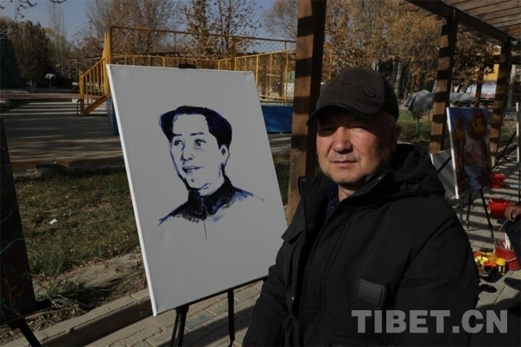 來到作畫區(qū)域,首先吸引記者注意的便是身穿黑衣、頭戴灰帽的西爾艾力·艾買提老人。在雪白的畫布前,老人用藍(lán)色和墨色顏料深淺描繪,勾勒出我們最熟悉的面孔。他向我們介紹說:“我畫的是我們偉大的毛主席年輕時(shí)候。沒有毛主席,我們中國人的生活不是這個(gè)樣子的,我很感恩他。我畫毛主席就是想讓更多人看見,讓他的故事得到更好的緬懷。”