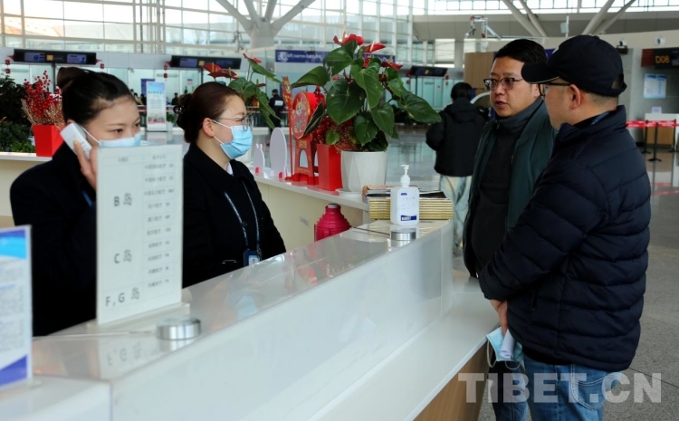 圖為拉薩貢嘎機(jī)場(chǎng)問詢臺(tái)工作人員解答乘客咨詢 攝影:王佳豪