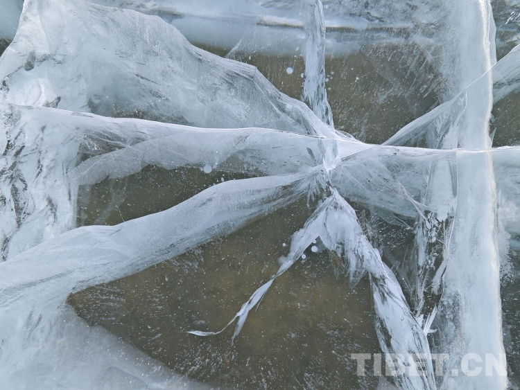 錯那湖湖面海拔4600米左右,面積400多平方公里,是世界上海拔最高的淡水湖,更有冰泡、冰裂、冰推等奇妙的自然景觀。當氣溫急劇下降時,水溫也驟降,湖底產生的氣體在上升過程中被凍在冰中,形成許多細小的白色氣泡,懸浮在厚厚的冰層之中。湖水表面一層被藏北的朔風快速凍結成冰,部分碎冰在岸邊堆積,形成隆起的“冰岸線”。又由于初春晝夜溫差較大,湖冰崩裂,形成網狀的冰裂紋路。這些透明裂紋從岸邊開始,像潮水一樣漫過平地,漫過羌塘草原腹地,漫到天邊,把羌塘大地裝扮成一個冰晶縱橫交錯的世界。(中國西藏網 文/李一凡 張萌萌 龍真多吉)