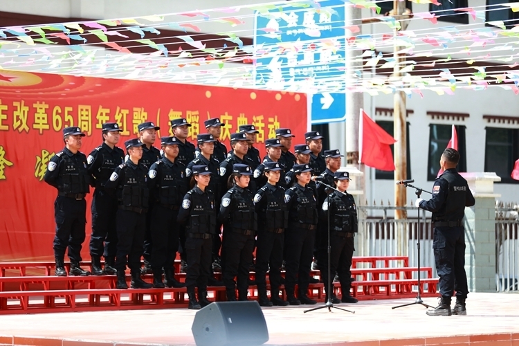西藏吉隆出入境邊防檢查站移民管理警察與駐地各單位干部職工及廣大人民群眾以舉行升旗儀式、文藝匯演的方式紀念西藏民主改革65周年。