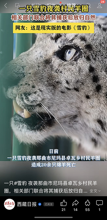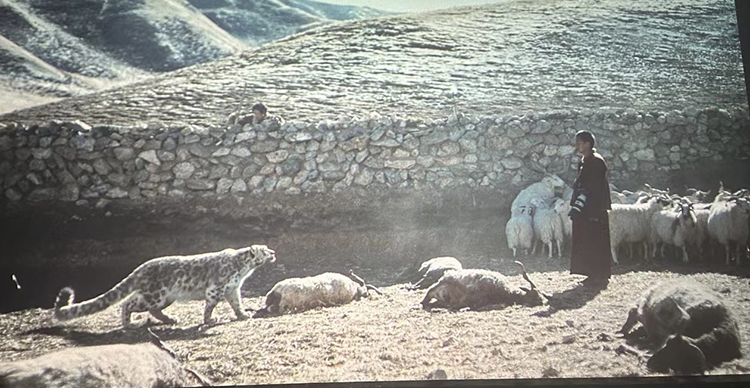 影片的結尾似乎很突然,雪豹終究沒有死在受損牧人暴怒的情緒和揮舞的錘子下,在人類文明的關照下,被主動解圍,回歸雪山,與小雪豹相會相伴。只有萬導這種深邃包容、沉著冷靜又充滿睿智的作家、藝術家才能挖掘和表現,這里蘊含著生命的慈悲和世人的智慧。對此,我們還有哪些拷問呢?