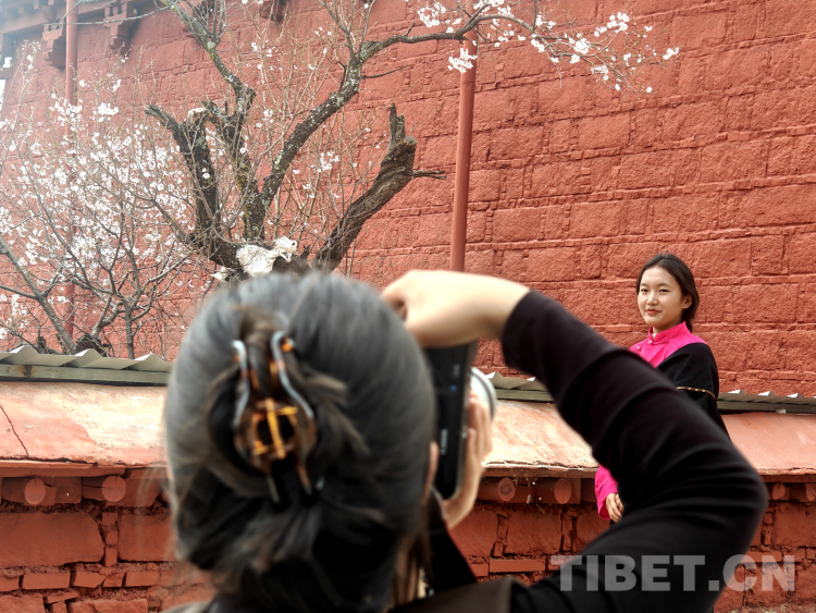 中國西藏網(wǎng)訊 每年4月,位于西藏拉薩主城區(qū)北郊山坡上的古剎帕邦喀(也稱帕崩崗),環(huán)繞寺院周圍的桃花盛開,引來了諸多當(dāng)?shù)厥忻窕蛴慰图娂娗巴p花、拍照。