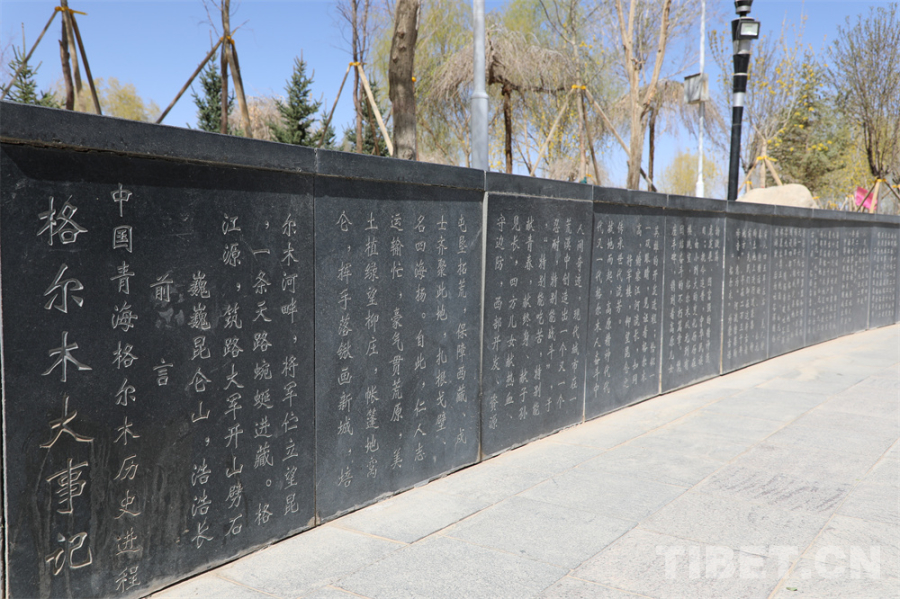 圖為公園內的花壇墻磚上刻錄著格爾木大事記 攝影:王茜