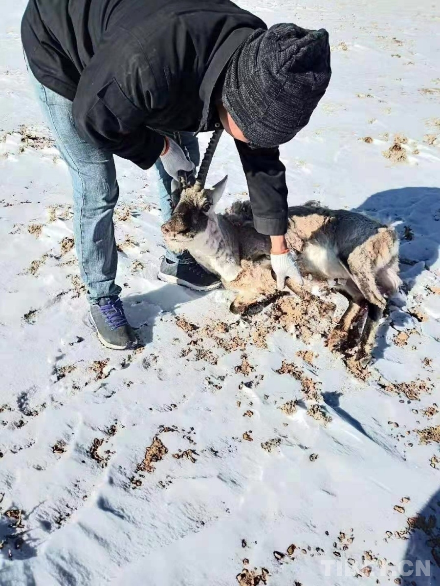 圖為西藏阿里地區(qū)革吉縣龍熱管理站野保員洛洛在雪地里正在救助一只受傷的小藏羚羊(野保員洛洛提供圖片)