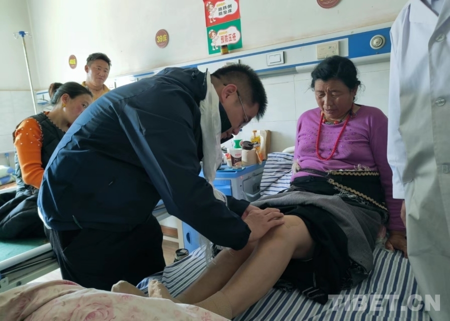 圖為北京大學人民醫院骨關節科學科助理,骨關節科黨支部書記李虎主任醫師在甘孜縣中藏醫院查看患者情況 攝影:朱鈺慧