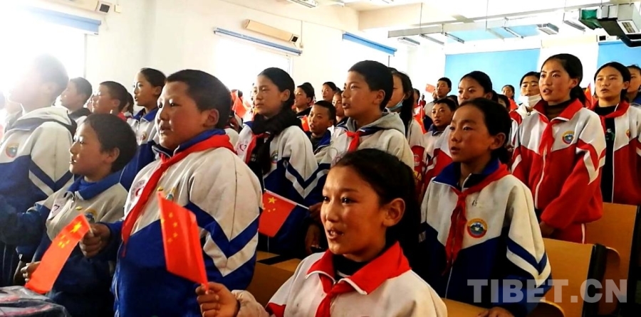 圖為四川省甘孜州石渠縣第二完全小學學生代表與醫療專家們一起高唱國歌 攝影:劉莉