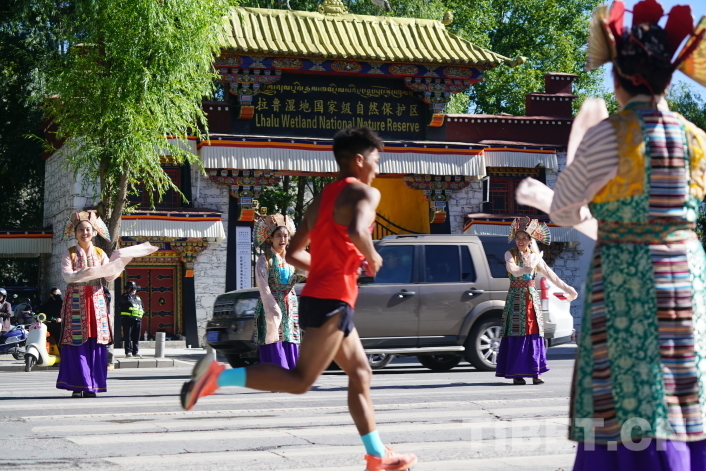 圖為 2024拉薩半程馬拉松18公里處參賽選手途經拉魯濕地國家級自然保護區,拉薩市城關區藏戲藝術團以藏戲的形式為選手加油助威 攝影:趙振宇