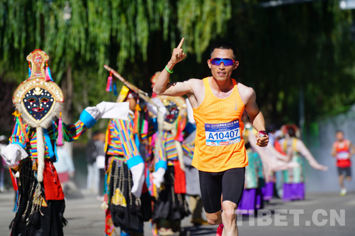在賽道18公里處,來自拉薩市城關區藏戲藝術團的演員們身著華麗的藏戲服飾,為每一位跑者舞動,為每一位跑者加油。參賽選手途經此處,紛紛拿出手機,記錄這獨屬于拉薩半程馬拉松的激情與浪漫。