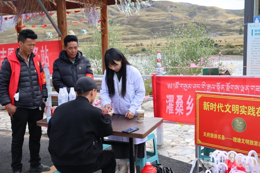從海拔4700多米的卡子拉山,到一派田園風(fēng)光的濯桑片區(qū);從傳統(tǒng)文化氣息濃厚的勒通古鎮(zhèn),到一望無際的毛埡大草原,理塘縣共設(shè)立了19處新時(shí)代文明實(shí)踐旅游服務(wù)站,每處站點(diǎn)都配備了至少5名志愿者,從9點(diǎn)到18點(diǎn),全天提供指路問詢、文明旅游宣傳、血氧飽和度測(cè)量以及免費(fèi)開水、免費(fèi)雨傘、應(yīng)急充電等志愿服務(wù),并協(xié)助交警開展交通安全宣傳、文明行車引導(dǎo)等工作。