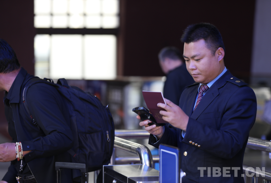 圖為拉薩火車站青年職工趙晨正在核驗旅客證件 攝影:格桑央金
