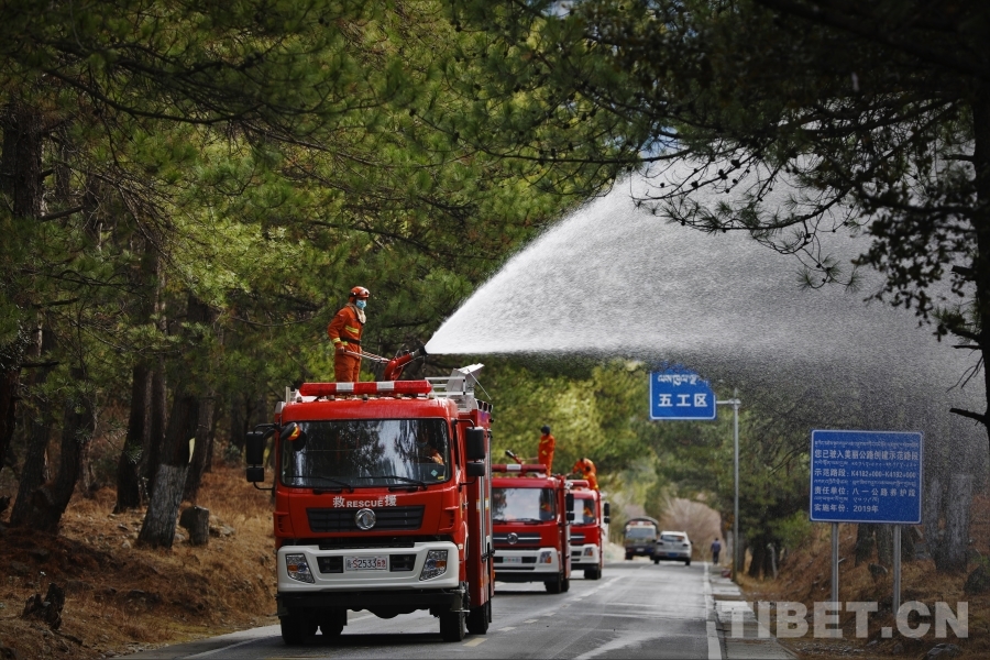 圖為消防員沿重點林區道路開展灑水增濕作業
