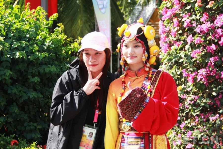 圖為第十二屆全國少數民族傳統體育運動會民族大聯歡活動現場,來賓與身著藏族服飾的演員合影 攝影:劉莉