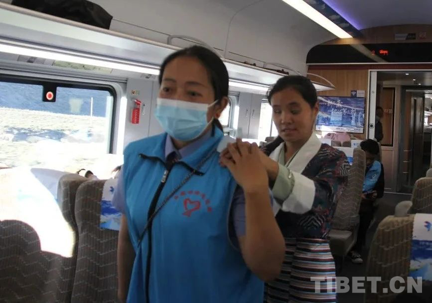 圖為“三站一途 天路導航”團隊在高原復興號上幫助視障旅客