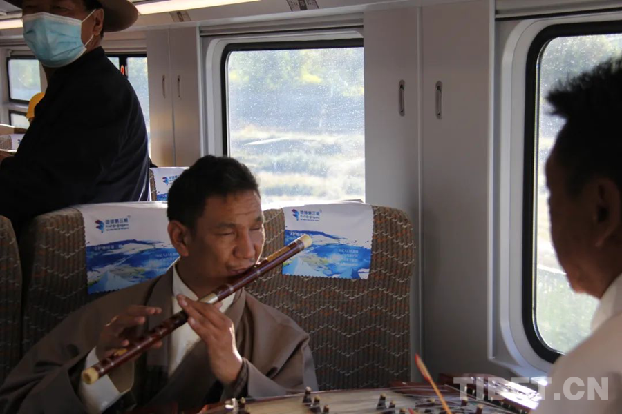 圖為在拉林鐵路開通運營1周年之際,“咔噠嘎布”樂隊受邀在高原復興號上表演