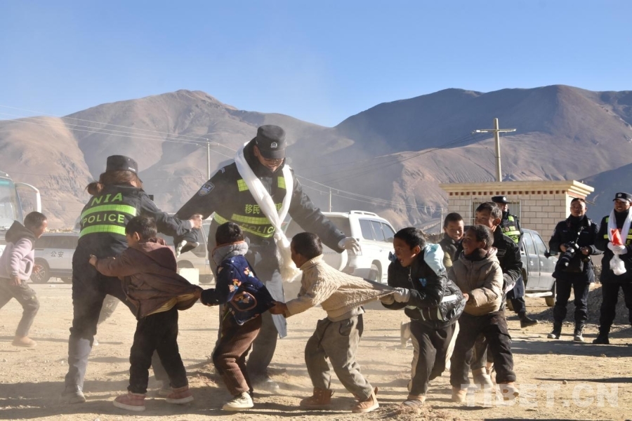 圖為在日喀則市定日縣長所鄉雜村安置點,移民管理警察和小朋友玩老鷹捉小雞游戲 攝影:卿光強