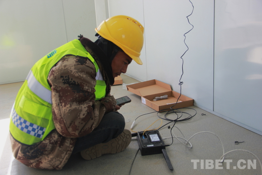圖為中國電信日喀則分公司智慧家庭工程師多次正在長所鄉森嘎村新建板房里調試光貓信號 攝影:劉莉