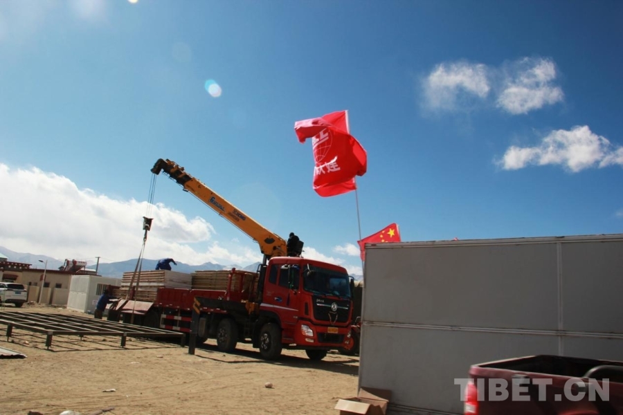 圖為工作人員正在長所鄉森嘎村卸新運到的板房 攝影:劉莉