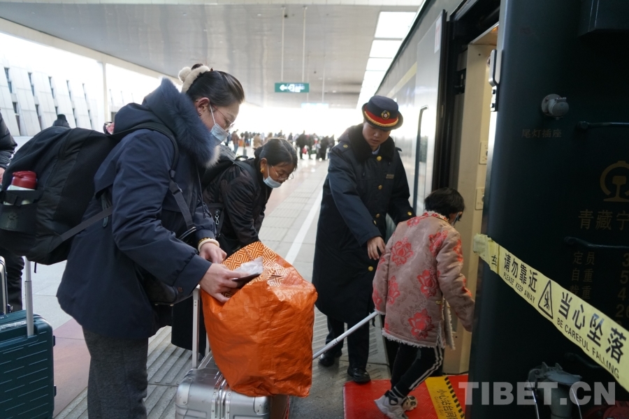 不一會,等待檢票上車的人排起了長隊,他們是來拉薩朝圣結束準備回家的藏族老人,他們是結束了一年工作回鄉過年的外地務工人員,他們是來拉薩探親的母子,他們是去成都與家人團聚的母女三人……短短15節車廂,囊括了中華民族各族群眾在春節來臨時短暫相聚于火車上的世間百態:大包小包的行李、火車上準備的食物、手中的轉經筒、和媽媽撒嬌的孩子、手機上跳動的畫面……