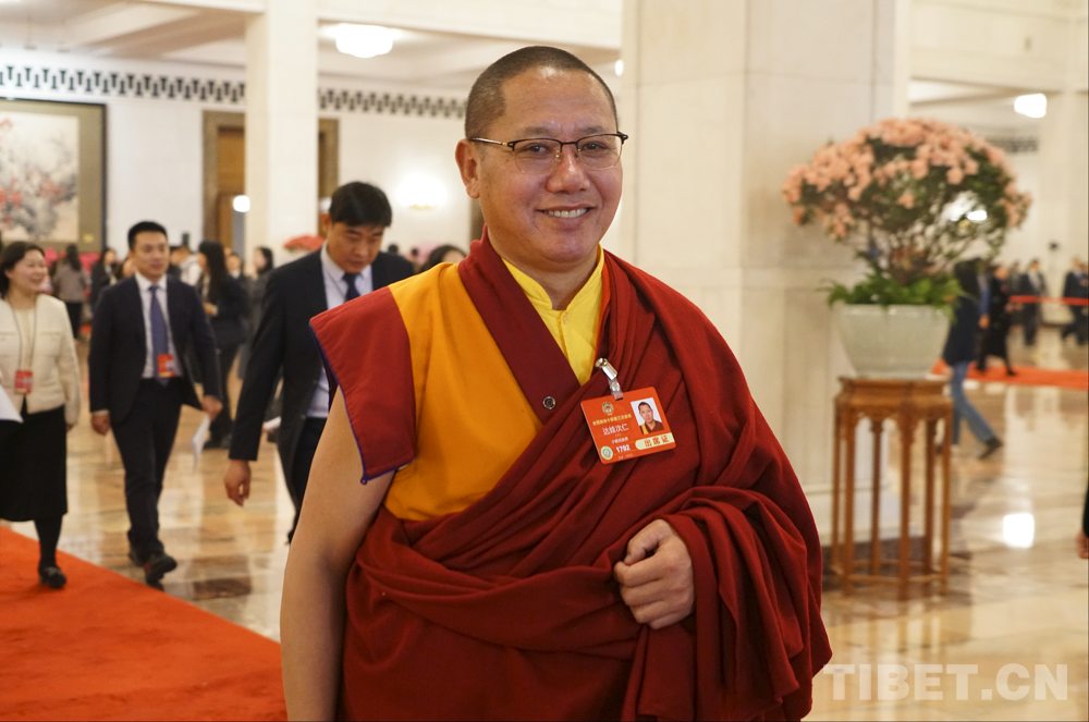 圖為全國政協委員達扎·尕讓托布旦拉西降措在人民大會堂前 攝影:楊眉笑