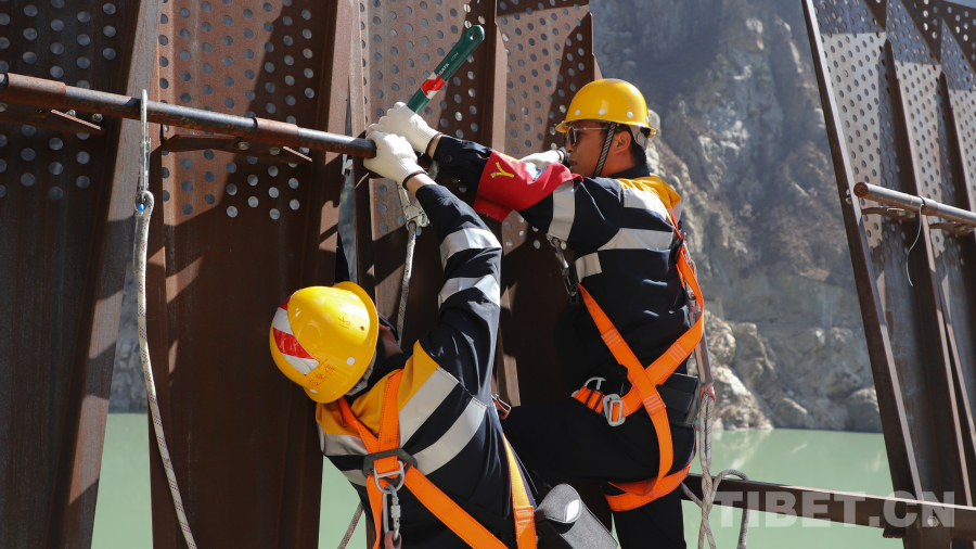 高空峽谷風急聲勁,每一位加查路橋維修工區上拱的職工都要經歷身體因恐高眩暈和不適,再到逐步適應和習慣,最終喜歡爬到橋的最高處眺望雅魯藏布江蜿蜒而過的過程。