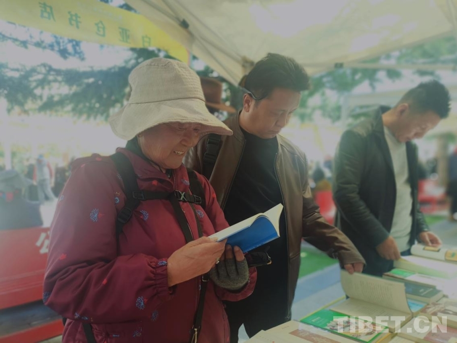 圖為4月19日,第二屆“拉薩春日書會”宗角祿康公園主會場內,市民在書攤前翻閱書籍 攝影:趙釗