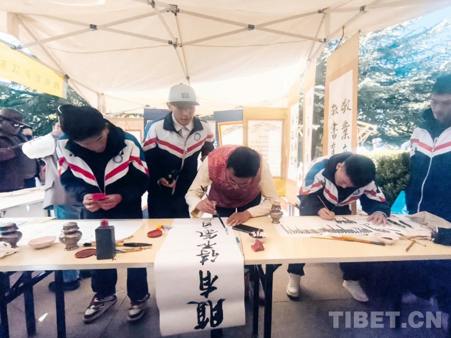 圖為4月19日,第二屆“拉薩春日書會”宗角祿康公園主會場內,拉薩江蘇實驗中學書法社的同學們在撰寫書法作品 攝影:趙釗