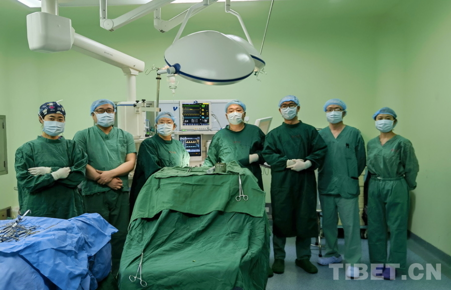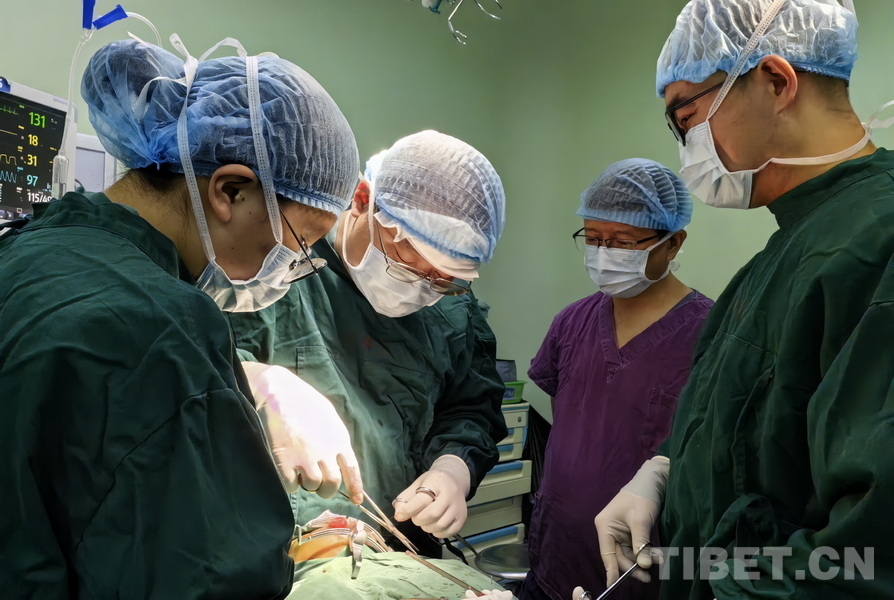 圖為火箭軍特色醫學中心口腔科主治醫師張曉然(左二)與阿壩州人民醫院口腔科團隊合作,為腭裂患兒實施腭裂修補手術,阿壩州人民醫院院長、主任醫師楊林(右二)前來觀摩手術