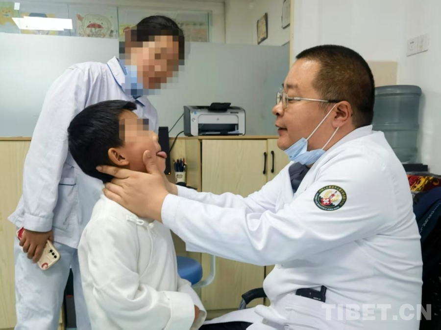 圖為火箭軍特色醫學中心口腔科主治醫師張曉然(右)正在為舌系帶畸形患兒查體