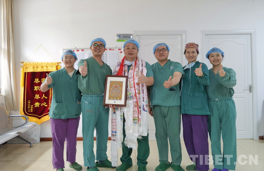 圖為阿壩州人民醫院口腔科團隊向火箭軍特色醫學中心口腔科主治醫師張曉然(左三)獻上哈達致敬