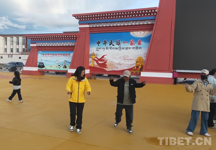 圖為在尼瑪縣民族團結進步主題廣場,筆者向扎西索朗學跳鍋莊舞 攝影:昂翁洛布