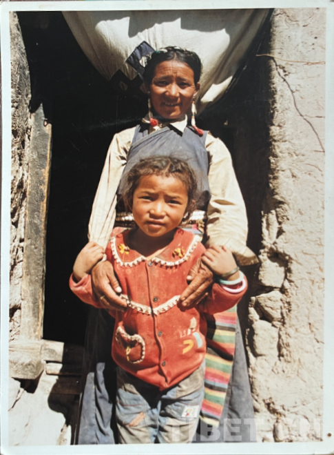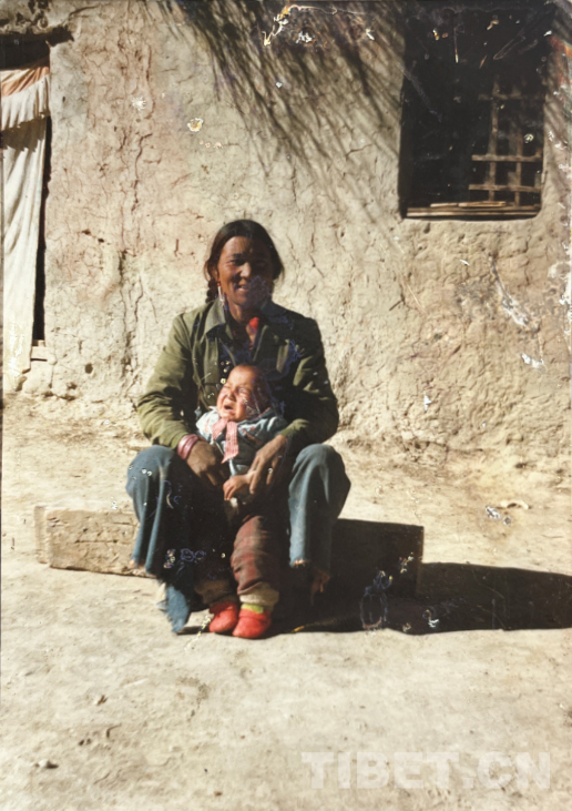 這是在我們家老房子門口照的。那時候全是土坯房,這間是四間房里最大的。大概是1990年左右。記得穿的這身衣服那些年很多人都穿,應該是軍裝,穿著這衣服騎馬去挖藥很多次。人民公社時期我們有八個生產(chǎn)隊,那時候要采藥掙工分,偶爾拉薩藏醫(yī)院的老師們會專程來札達,我們也要幫忙去采藥。這邊藥材很多,如雪蓮花、黃連、蒂丁等。拍這張照片時孩子的鞋和幾件衣服是我自己織的,但要買好衣服還得去阿里地區(qū)。那時我丈夫已經(jīng)在開車,我們家條件稍好些,但也不是村里最好的。