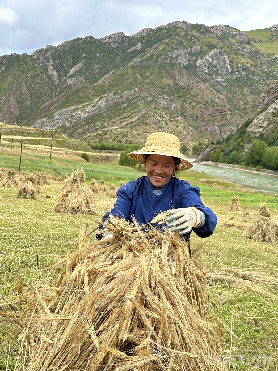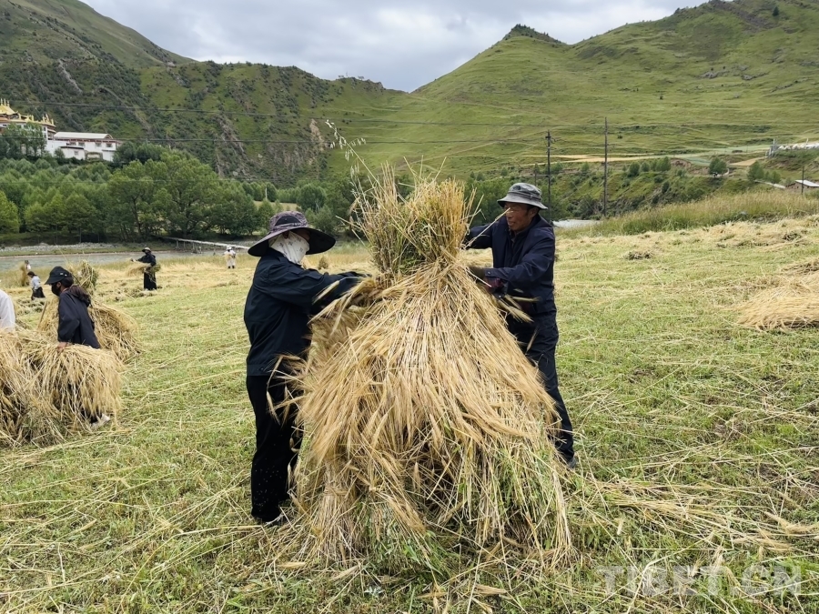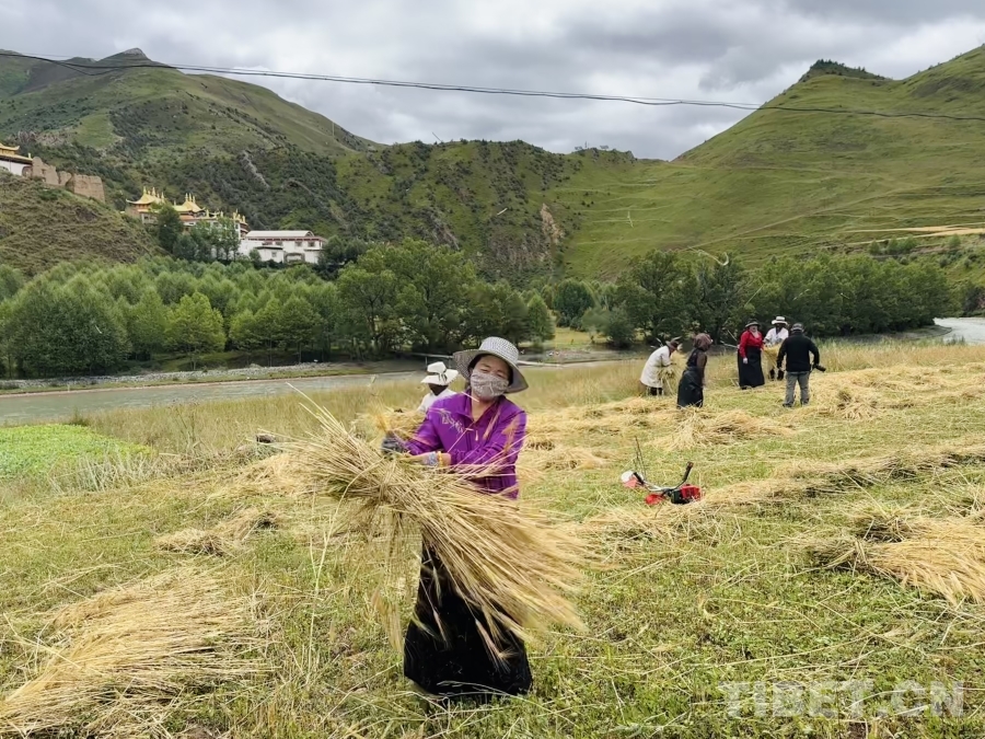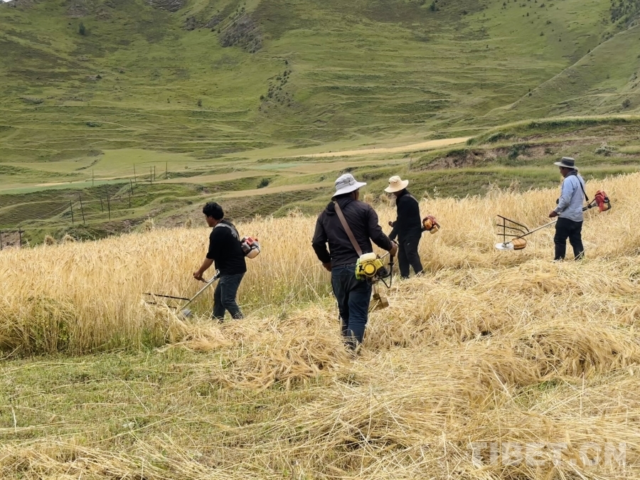 金穗低頭,豐收在望。孜榮村人們用勤勞的雙手繼續書寫著“高原糧倉”的豐收故事。(中國西藏網 記者/畢然 龍真多吉)