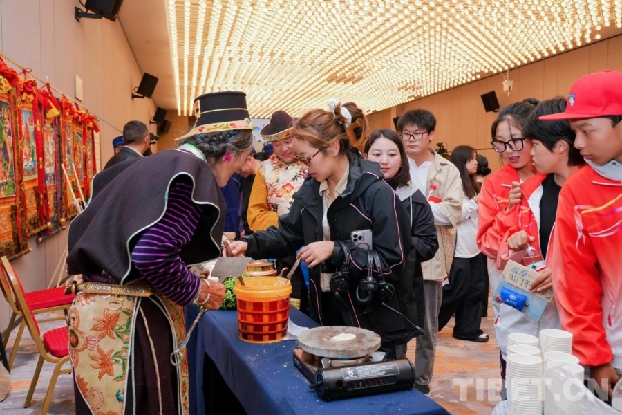 活動現場還設置了茶歇區、展覽閱讀區和非遺體驗區。嘉賓們品嘗工布阿拉酒與藏式茶點,欣賞青年藝術家畫作和林芝主題圖書,并親身體驗藏香制作、藏文書法、藏紙拓印等非遺項目,多維度感受林芝文化的生機與魅力。