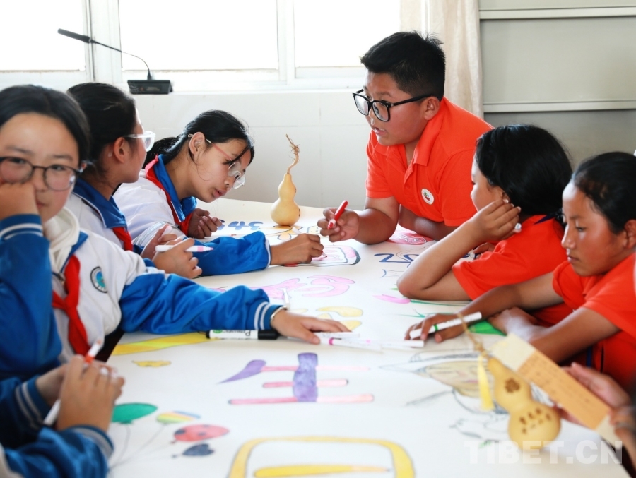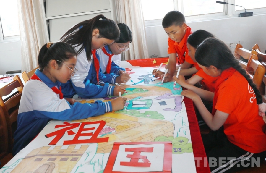 圖為西藏阿里噶爾縣孔繁森小學、山東聊城堂邑鎮中心小學的孩子們共同創作迎國慶主題畫卷 攝影:劉莉